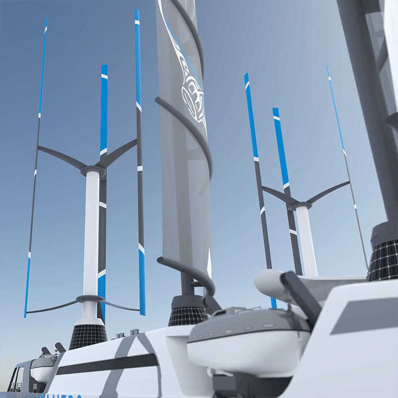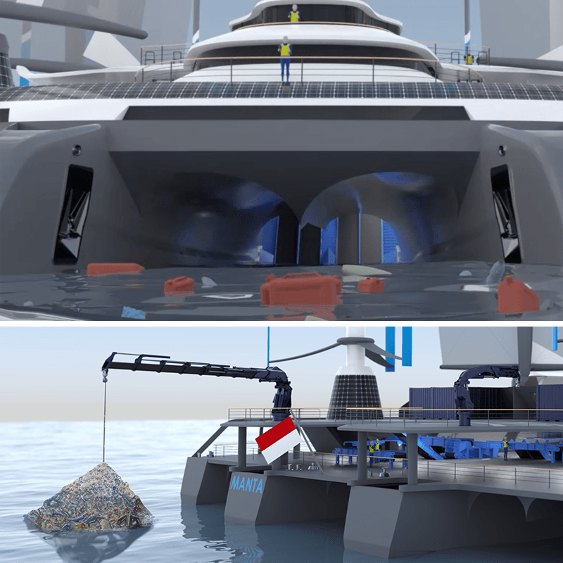 1- La construction d’un navire unique en son genre, navigant aux énergies propres, solaire, éolien et électrique, Le MANTA. En complément à la mise en place de solutions terrestres préventives efficaces, il faut agir en mer et collecter au plus près des sources de pollution. Il sera capable de collecter, trier, compacter et stocker ou valoriser en grandes quantités ces déchets, grâce à une véritable usine à bord.